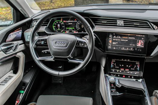 Därutöver är den kraftigaste motorbromsinställningen långt ifrån tillräcklig för att kunna erbjuda så kallad enpedalskörning där det räcker med att släppa på gasen för att bromsa bilen rejält. Audi vill att man ska använda bromspedalen som i en vanlig bil, men varför inte bara låta föraren välja hur han vill ha det? Precis som alla andra elbilar på marknaden gör. Dessutom förmedlar styrningen lika mycket känsla som en kallblodad psykopat. E-tron presterar alltså inte särskilt väl när det kommer till körkänsla.