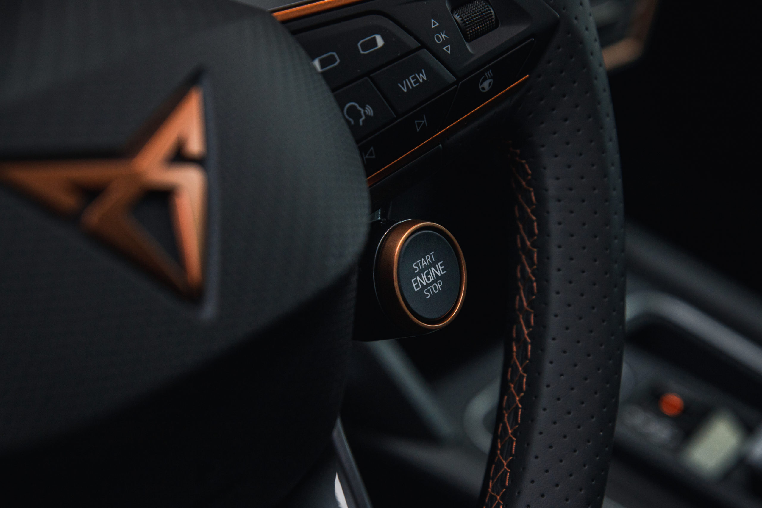 Vid en första anblick noterar man det aggressiva formspråket som tar ett rejält kliv från Seats mer slätstrukna alternativ. Designspråket skriker “se på mig!” tack vare de aggressiva linjerna, LED-rampen och den spektakulära färgen som skimrar mellan midnattsblå och nattsvart. De designmässiga dragen är aggressiva och påtagligt sportiga vilket gör det uppenbart att det är en potent bil vi har att göra med. Det här understryks ytterligare av diffusorn som ramar in de fyra avgaspiporna och de bronsfärgade bromsarna från Audi RS3. Designspråket är faktiskt så aggressivt att jag skulle våga påstå att det här är lite av en miniversion av Lamborghini Urus.