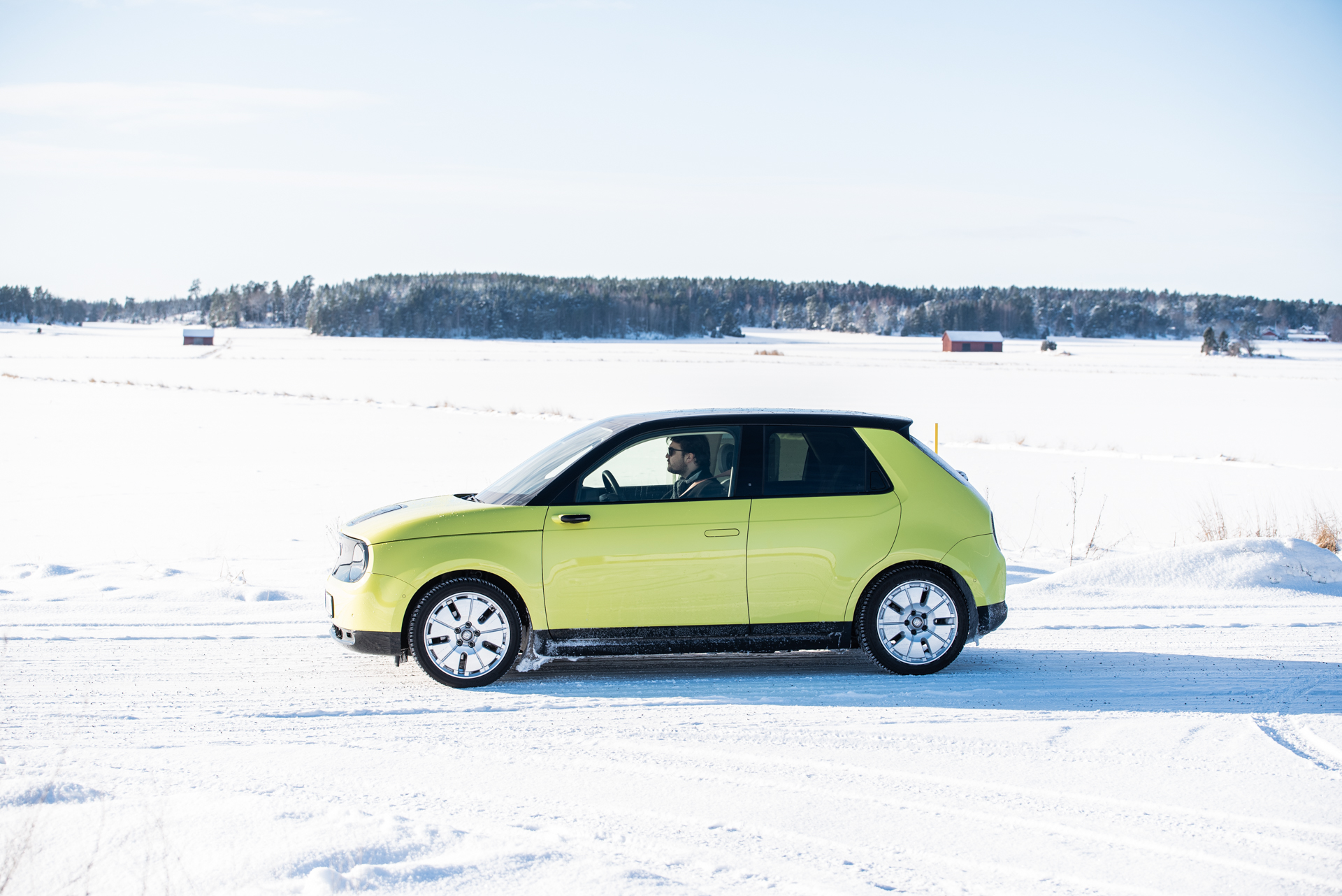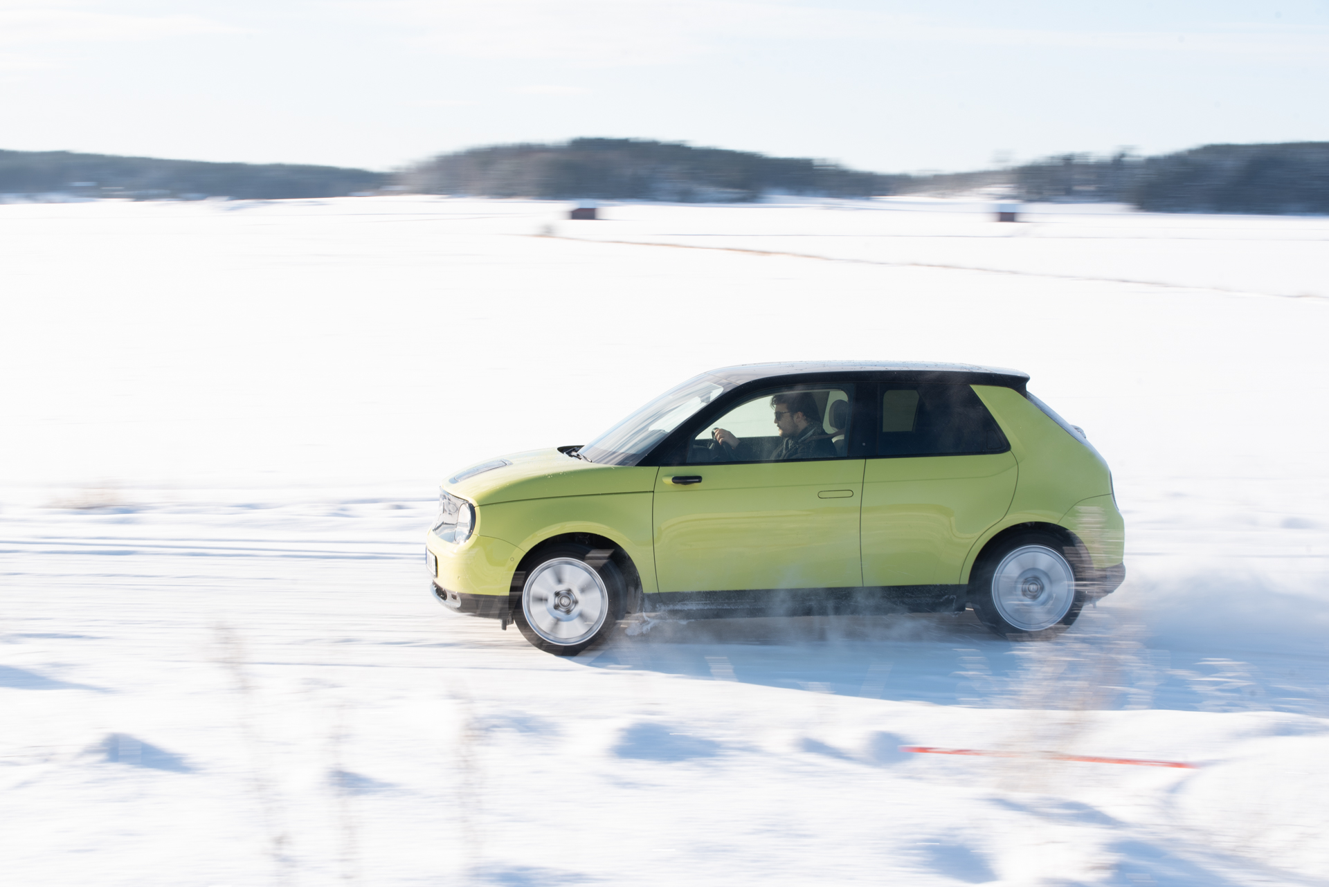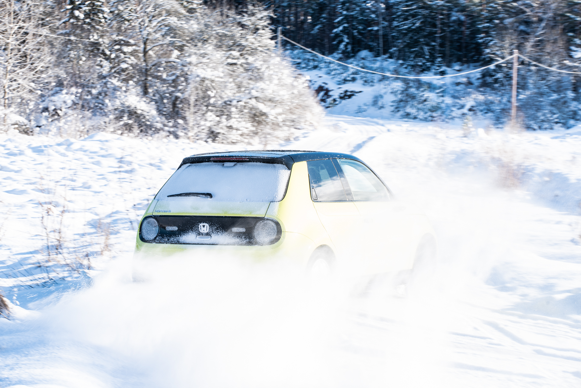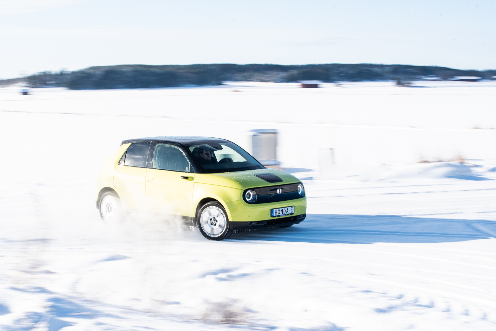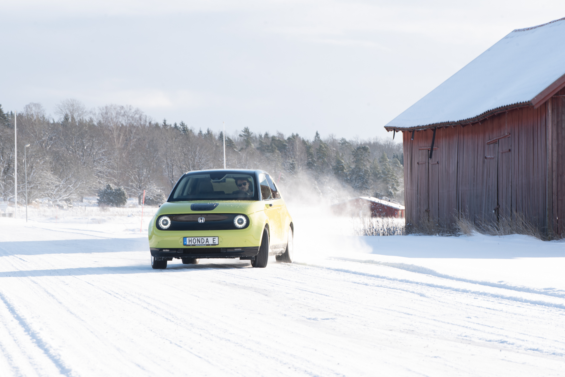 Om Honda E är rolig att köra om sommaren är det nämligen ingenting i jämförelse med hur den är att ratta i vinterväglag. Det är barnsligt roligt att stänga av antispinn och susa fram längs snötäckta småvägar. Tyvärr ingriper antisladden lite onödigt mycket, som om Honda glömt bort alla resurser de har lagt på att göra E välbalanserad och förutsägbar. Det enda sättet att stänga av systemet är att gå in och pilla bland säkringarna, men det överlåter jag till Honda E-förare som äger sina bilar att göra.