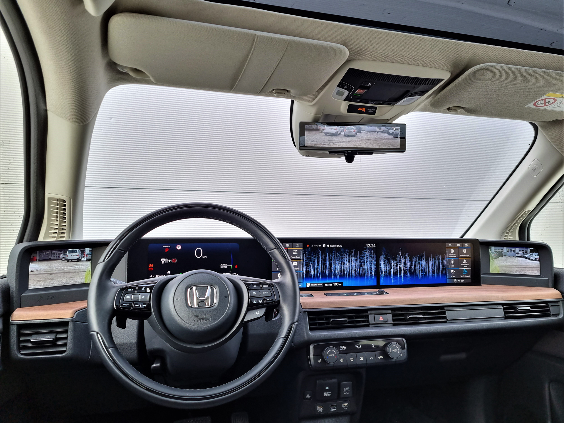 Något som tvärt emot vindrutetorkarna och sidofönstren upplevdes som positivt i kylan var interiören. Honda har fattat att en smartphone inte måste vara den enda förebilden när man skapar en bilinteriör med premiumkänsla. Honda E har rejält med touchskärm, som sträcker sig över hela instrumentpanelens bredd, men den har också knappar och vred för allt man kan tänkas vilja pilla med under färd (även om man har handskar på sig). Lösningen spelar den designmässiga resan framåt och bakåt i tiden rakt i händerna, samtidigt som den skänker en grad av funktionalitet man bara kan drömma om i de flesta moderna premiumbilar.