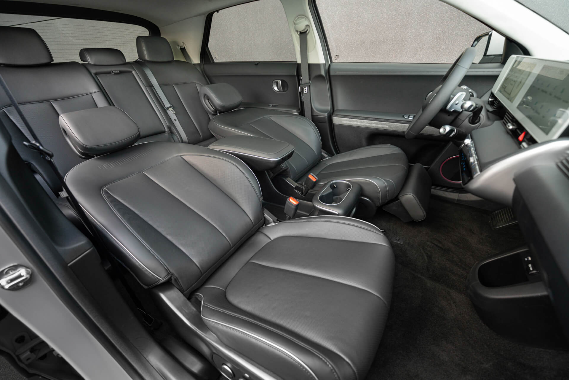 Framsätena kan med hjälp av ett finurligt vadstöd justeras till en position som ger optimal avslappning. Efter att ha använt funktionen frekvent så ställer jag mig frågan varför inte alla elbilar har något liknande? Laddstopp är tyvärr en ofrånkomlig del av elbilslivet och att kunna tillbringa tiden på ett behagligt sätt lär vara en prioriterad komfortaspekt för många konsumenter. Faktum är att sätena överlag är riktigt bra och trots långa resor känner man sig aldrig trött i kroppen.