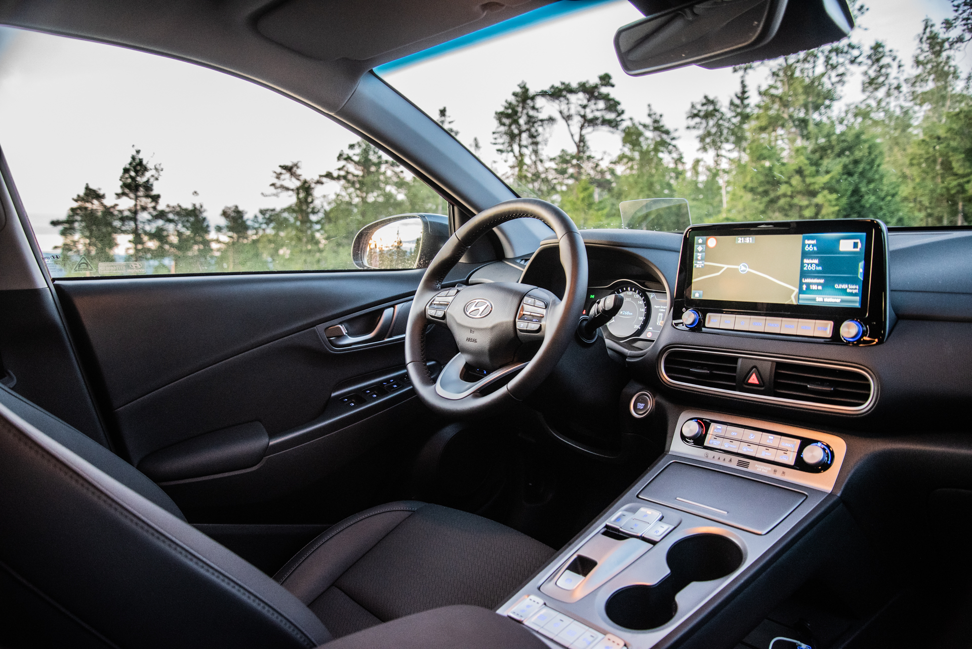 När man konkurrerar med pris som främsta argument tenderar kvaliteten att lida, och så är även fallet med Kona Electric. Interiören – med dess silverfärgade mittkonsol i hårdplast – för tankarna till ett charterplan, medan materialvalen överlag lämnar mycket att önska. Komforten är trots det riktigt bra, och det är enkelt att hitta en bekväm sittposition i de läderklädda stolarna, mycket tack vare de 16 olika lägesinställningarna vilka manövreras elektriskt. Med ventilerade säten tacklar man dessutom sommarhettan utan problem, en funktion som sällan går att finna utanför premiumsegmentet. Andra tekniska finesser som återfanns i testbilen är exempelvis filhållningsassistent, bromsassistent, adaptiv farthållare, head-up-display, och en 10,25 tums stor infotainmentskärm som både är lättanvänd och snabbarbetad.