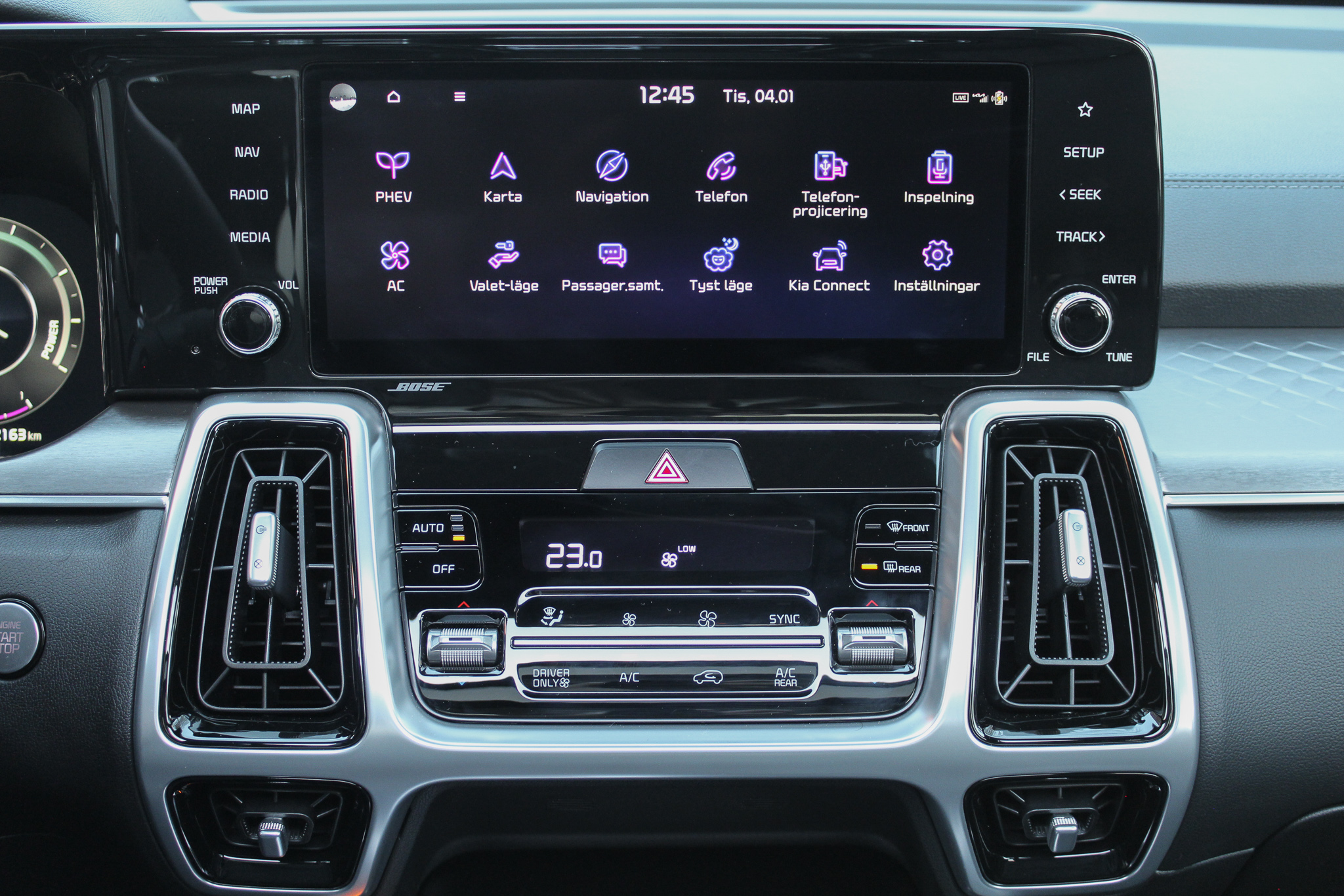 Det absolut största problemet med Sorento Plug-In Hybrid är uppvärmningen av kupén. Det kan låta som ett märkligt konstaterande men låt mig förklara. Plug-in hybridbilar kan antingen värma kupén genom bränslevärmaren, en värmepump, en elektrisk värmare eller som i Kias fall genom att starta förbränningsmotorn. Under testperioden låg yttertemperaturen på mellan -10 och -3 grader och med klimatanläggningen inställd på 22 grader så innebar det att motorn startade varje gång bilen rullade iväg, trots att batteriet var fulladdat.