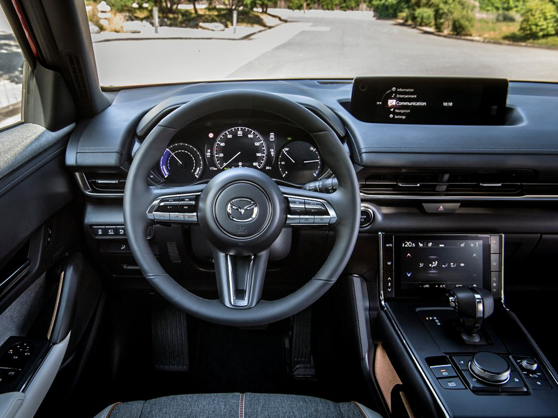 Designfilosofin fortsätter även på insidan. Bakom ratten känns det som att man befinner sig i ett halvt återvunnet dansk-japanskt vardagsrum. På sätt och vis stämmer det också eftersom Mazda har ansträngt sig för att materialen ska vara både återvunna och veganska. Visst låter det kanske löjligt, men oavsett vad man tycker om veganism är MX-30 en utomordentligt trevlig bil att befinna sig i. Här finns både en oerhört snygg ratt, schyssta detaljer i kork och en härlig kontrast mellan mörka och ljusa ytor. Infotainmentsystemet är även det alldeles fenomenalt lättarbetat, men man måste leva med en svensk språkinställning som verkar komma direkt från Google Translate.