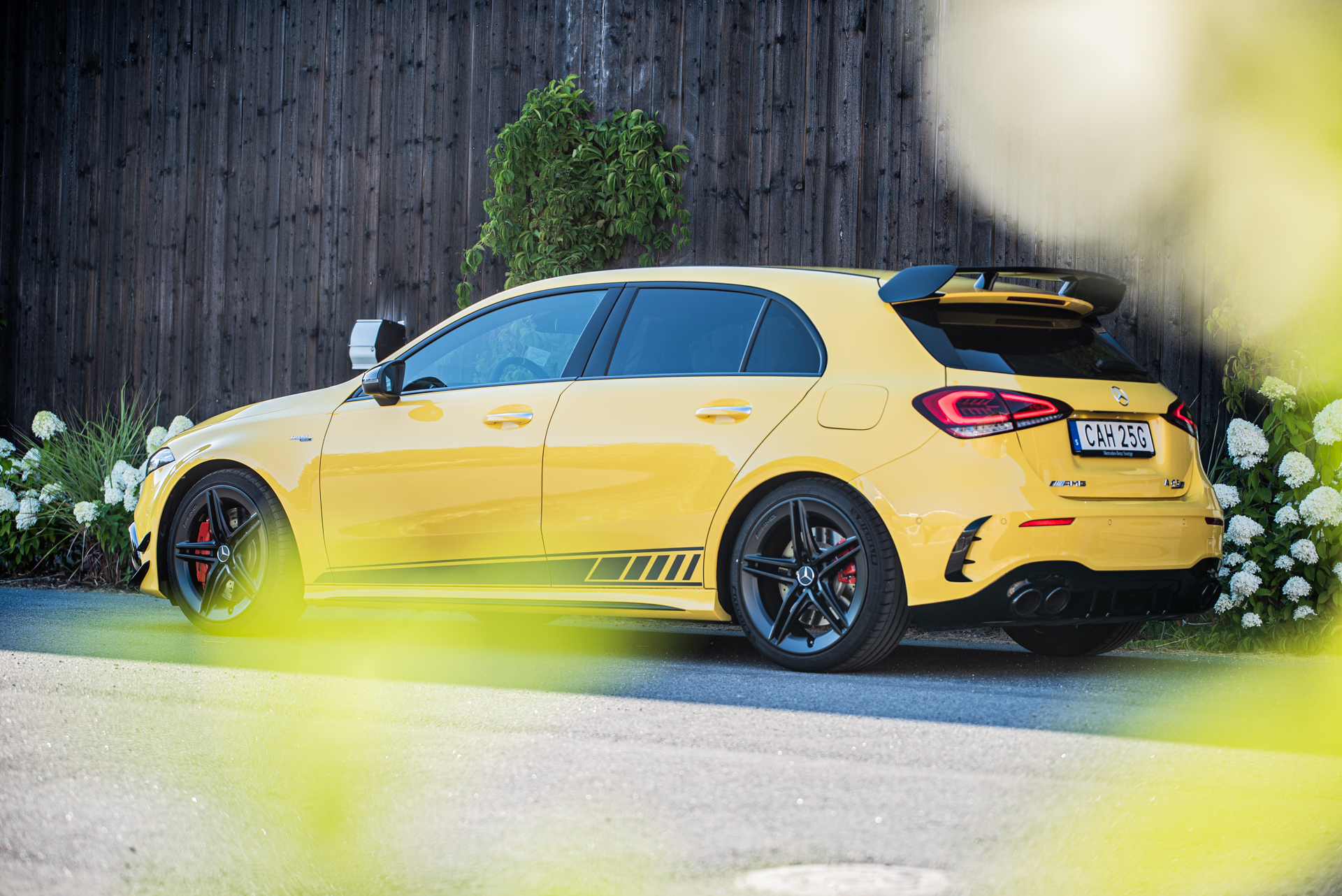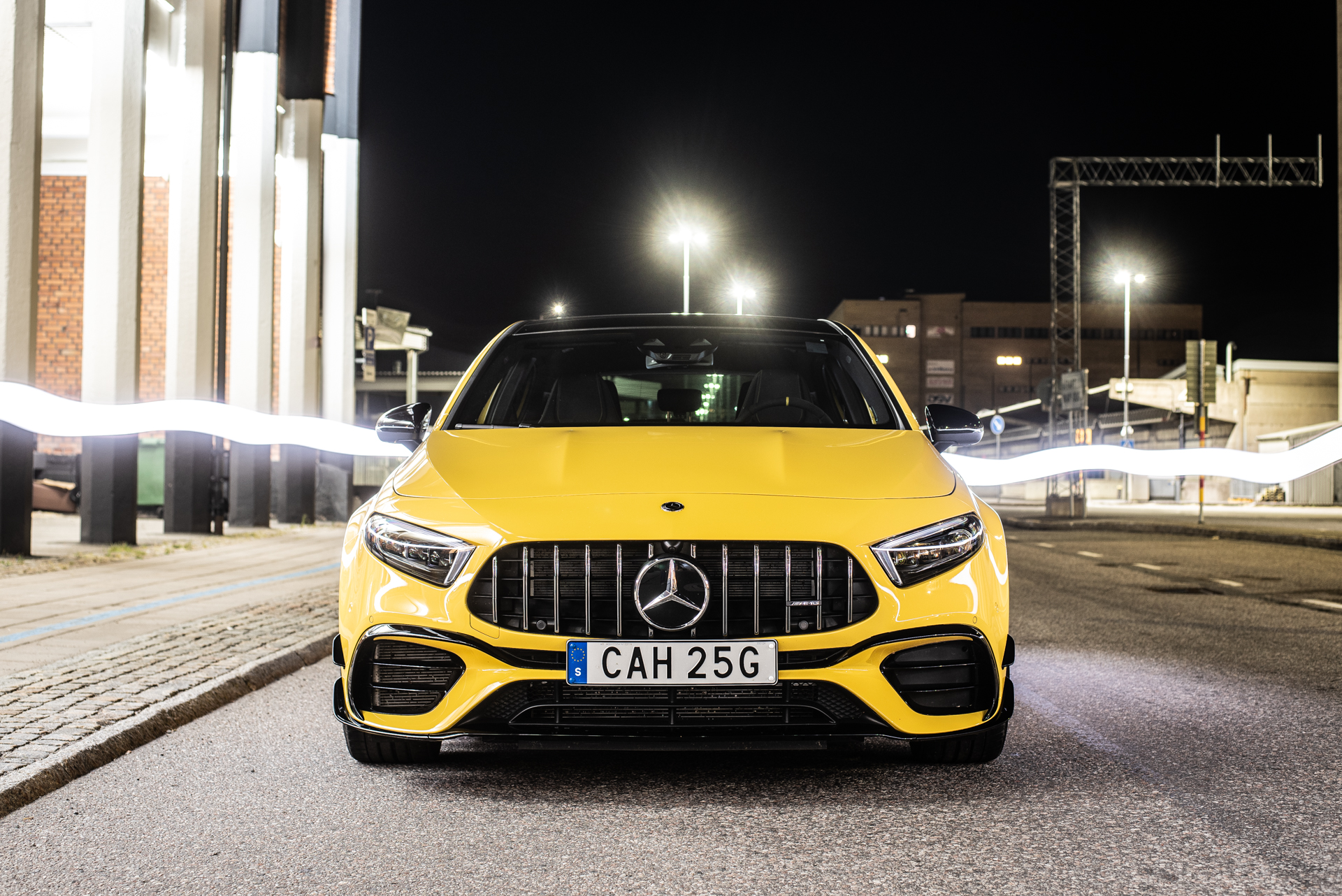 Utseendemässigt var vår testbil utrustad i Fast & Furious-anda. Den gula lacken, den enorma vingen, grafiken på sidan drog vardera sina strån till stacken för att framhäva dess busiga anda. Mercedes-AMG A 45 S är hur man än vrider och vänder på det något av en ligistbil. Den går att konfigurera så att den ser ut som en sleeper – gemene man lär inte se skillnad på en A 180 och en A 45 – men med solgul lack gör den helt klart väsen av sig.