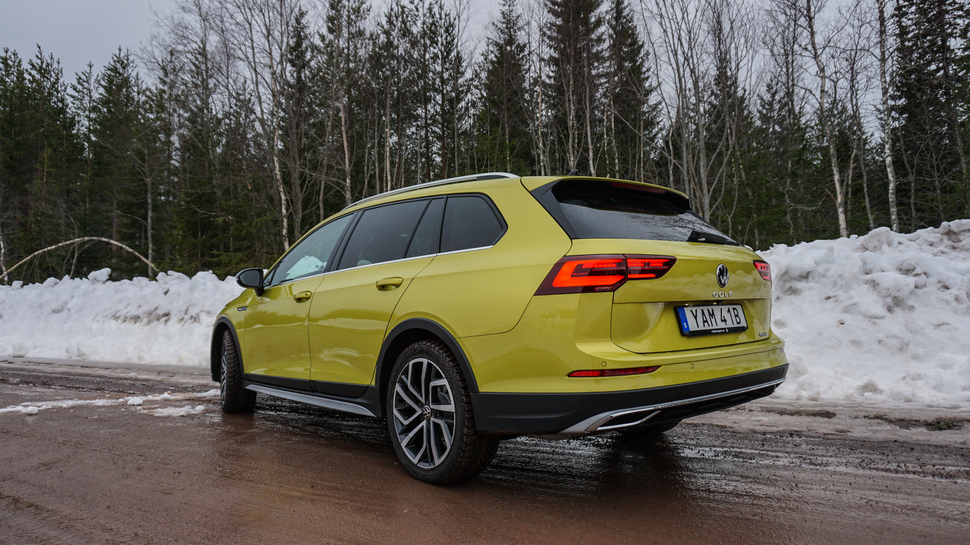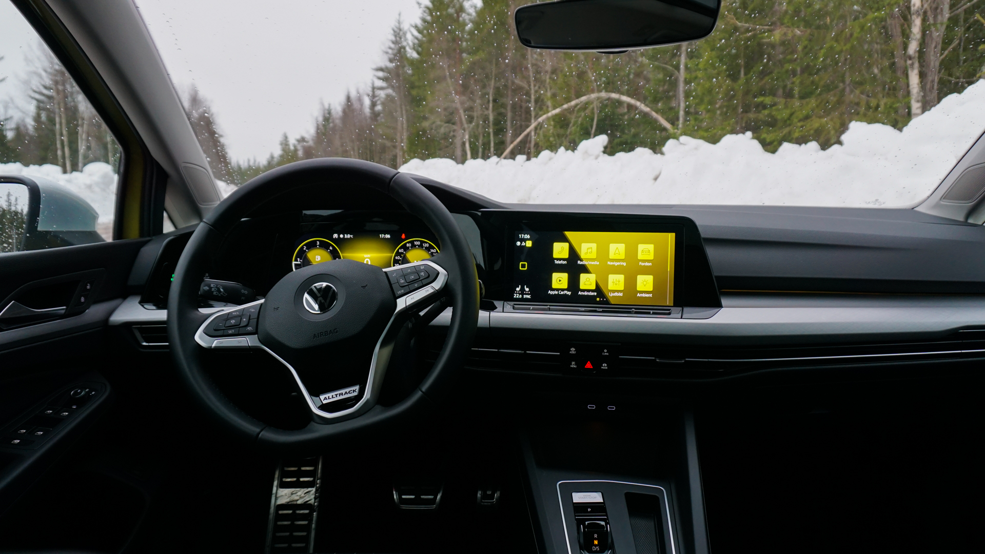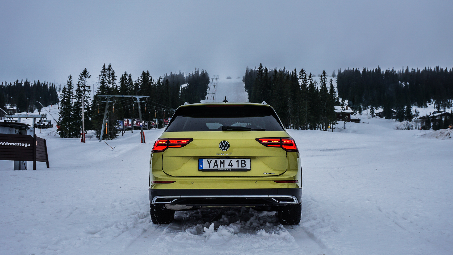 Det första man slås av när man ser Volkswagen Golf Alltrack är den spygröna färgen som gör att den sticker ut bland alla andra bilar i Sälen som mest verkar inspirerats av en svartvit film. Färgen poppar verkligen i kontrast till den vita snön och i kombination med de svarta plastskärmarna runt hjulhusen känns det som att bilen har i sin självklara plats i den svenska fjällmiljön. Alltrack-kostymen medför ett betydligt biffigare uttryck jämfört med den annars ganska timida auran som vanliga Golf förmedlar. Känslan av att inte en enda snödriva kan sätta stopp för fordonet är påtaglig.
