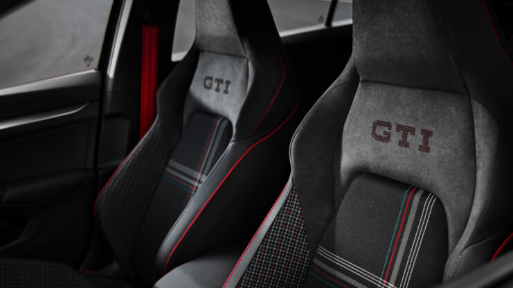 På insidan möts man av klassisk GTI-väv på stolarna, men i två olika mönster och med lite grönt som matchar exteriören. De fysiska rattknapparna har fått sig en mörkläggande behandling och på botten av ratten sitter jubileumslogotypen.