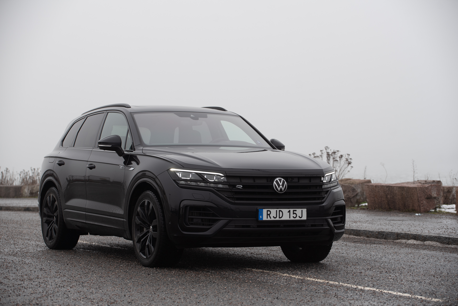Utseendemässigt ser Touareg R något sportigare ut än sina stallkamrater men det krävs egentligen ett mikroskop för att se skillnaderna, åtminstone om man bortser från det enorma R:et på bagageluckan. Vår testbil var utrustad med svarta fälgar och svart lack, en kombination som är gräslig och osar kriminalitet.