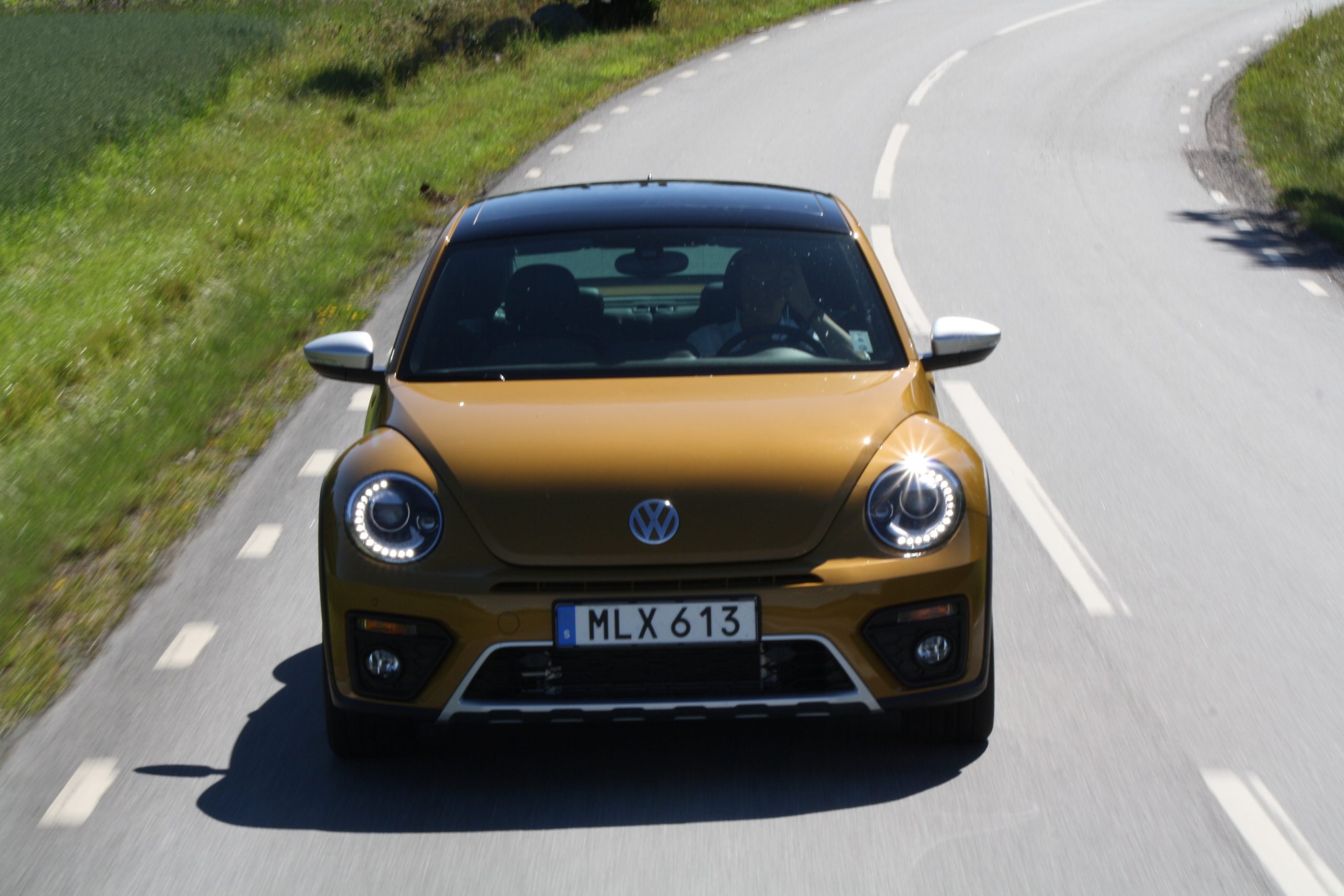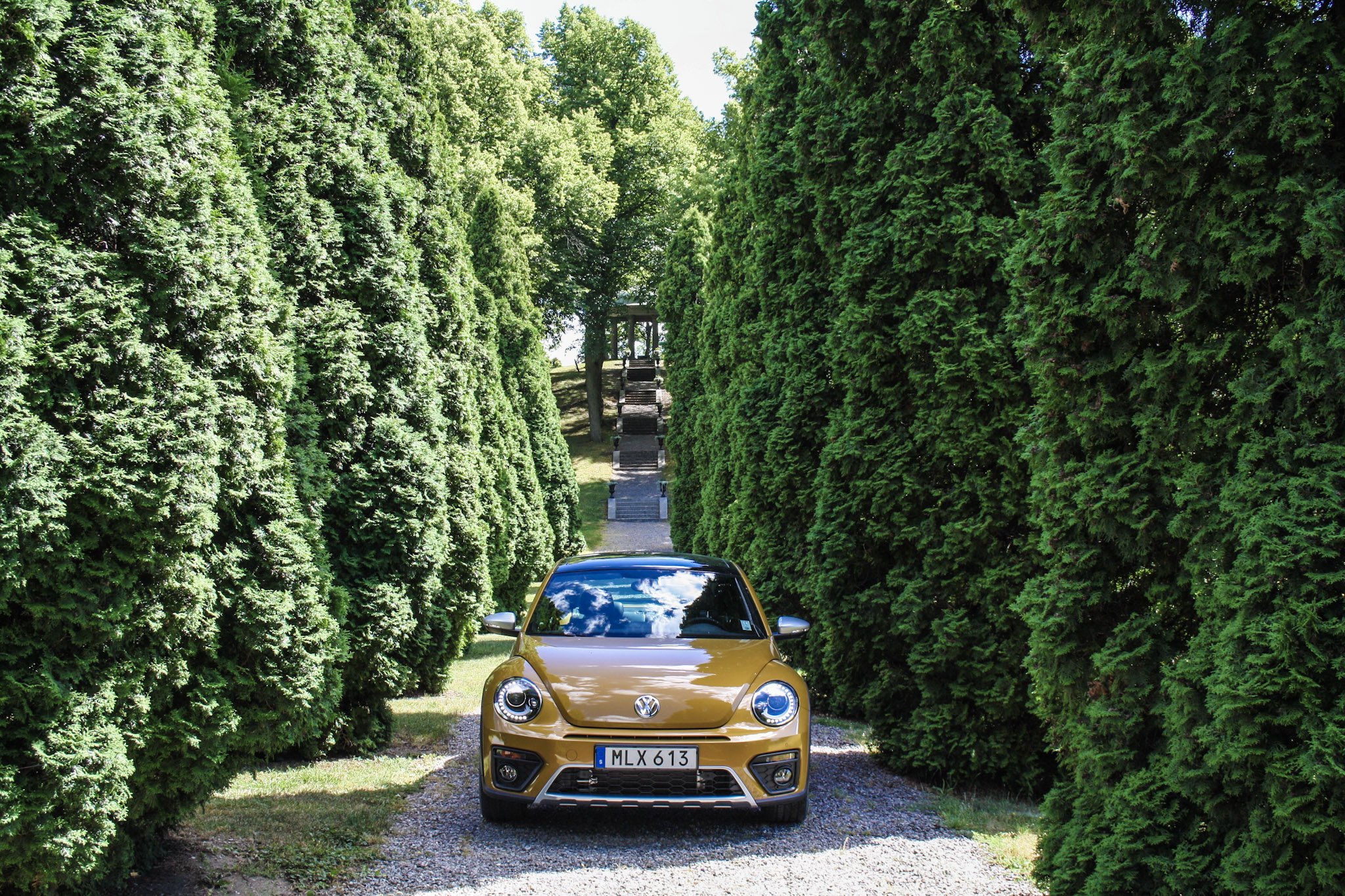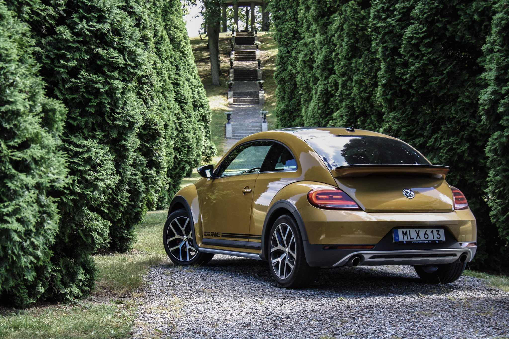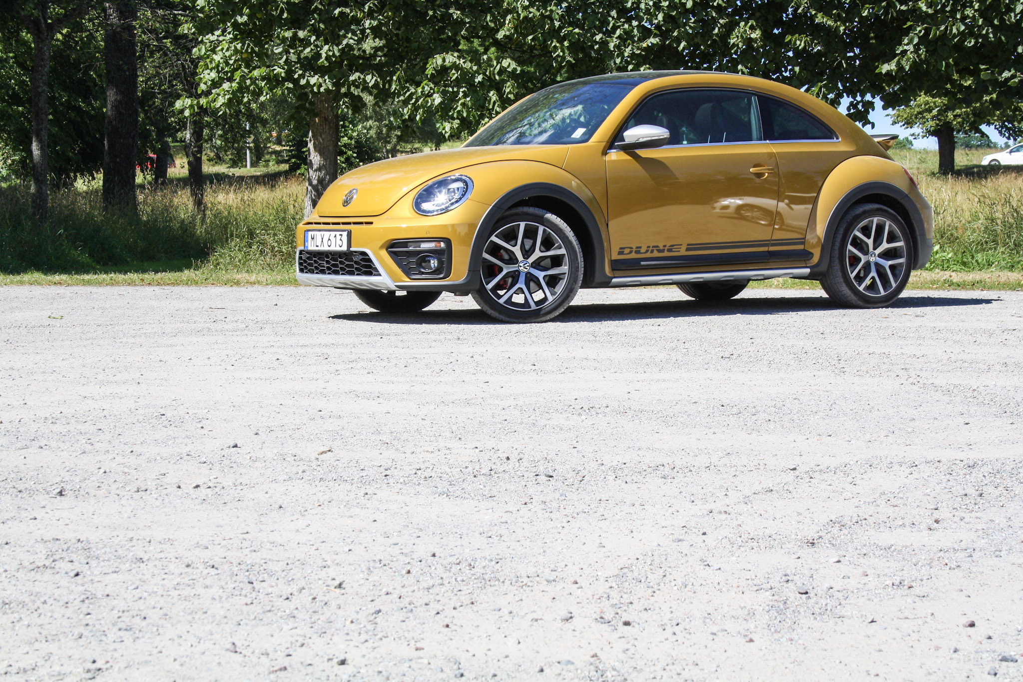 Bilen vi hade var inte en vanlig Beetle, utan en Dune. Det innebär att det är en sportigare version än den vanliga, samt att den har en offroad-design. Likt Audis ”Allroad” och Volvos ”Cross Country” innebär detta att bilen har 1 cm högre markfrigång än tidigare samt lite svart exteriörsplast här och där som sitter på enbart för syns skull. Dune kan fås med en lack som heter ”Sandstorm Yellow Metallic” och som gör att den på vägarna sticker ut lika mycket som en paradisfågel i ett hönshus.