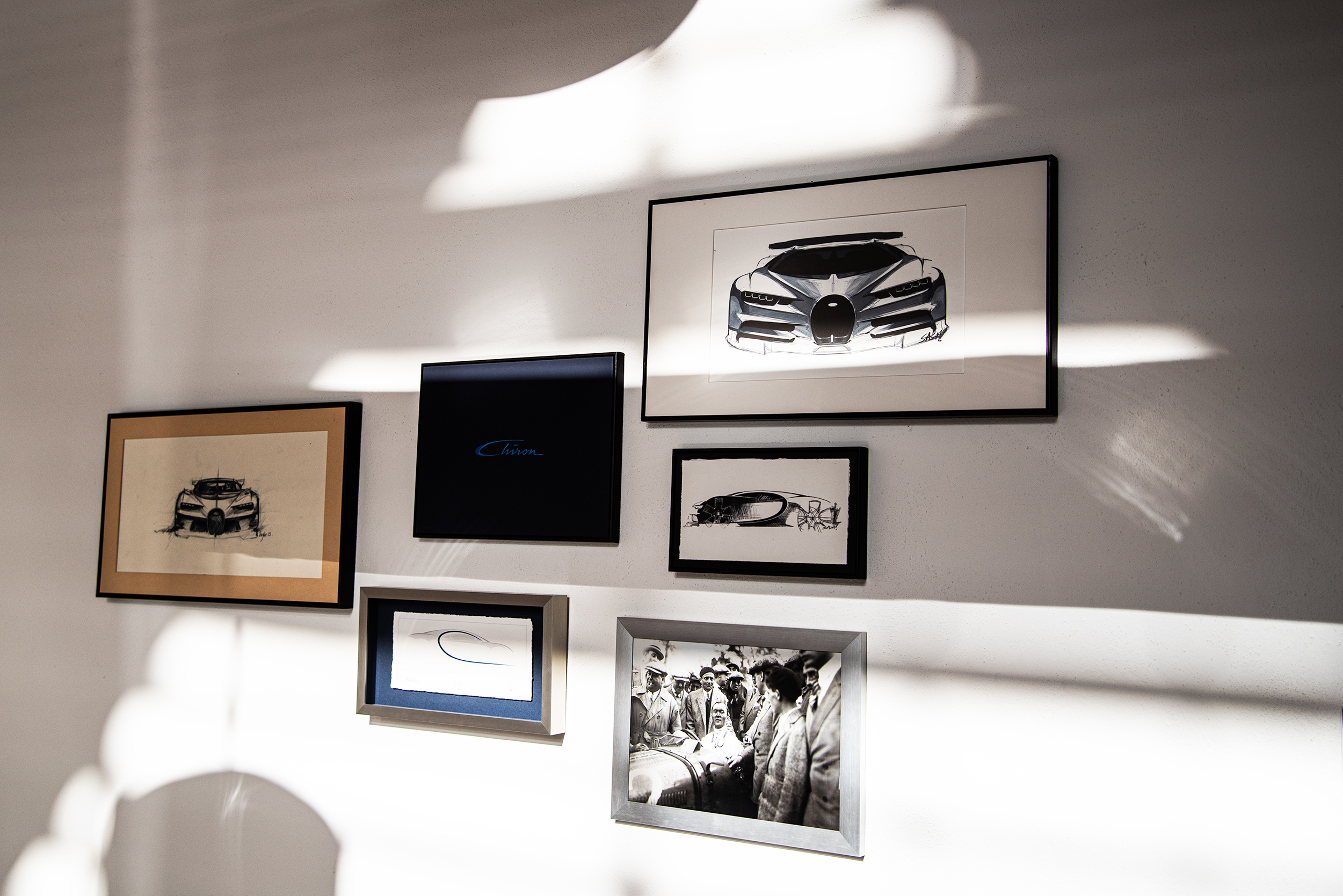 Showroomet är naturligtvis inrett ytterst smakfullt med möbler och tavlor särskilt tillverkade för Bugatti. Jag slogs av vill-ha-känslan gång på gång men jag insåg också snabbt att prissättningen tyvärr inte matchar min budget. Om jag hade varit en Chiron-spekulant hade jag dock yttrat orden ”jag tar en uppsättning av varje” snabbare än jag hinner säga ”Molsheim”, detsamma gäller den Bugatti Divo som kompletterade atmosfären i rummet. Läckert!