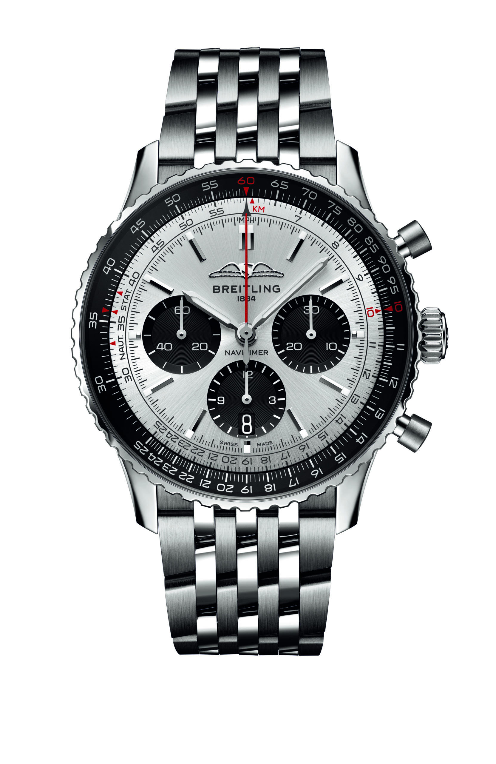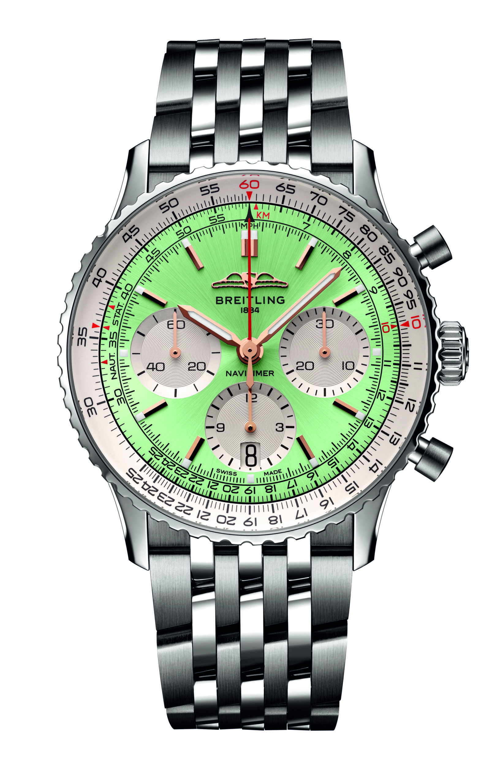 Klockan har också växt från original-Navitimerns boettdiameter på 40 mm, och erbjuds nu i storlekarna 41, 43 och 46 mm. I samtliga fall är urverket Breitlings nya, COSC-certifierade Caliber 01, med datumkomplikation och en kraftreserv på 70 timmar. Samtliga storlekar går att få med boett i antingen rostfritt stål eller 18 karat guld, och med urtavlor i en hel drös olika färger; bland annat blått, silver, koppar och mintgrönt.